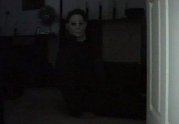 But then the camera takes us on a tour around the Strode house. In a dark room, there is a man wearing coveralls and a Michael Myers mask that looks different than the one Wilbur was wearing. This second Michael Myers is alone and standing in the darkness, then he performs some typical Michael Myers movements such as slashing and getting up from laying on the floor like Nick Castle did in the original Halloween.