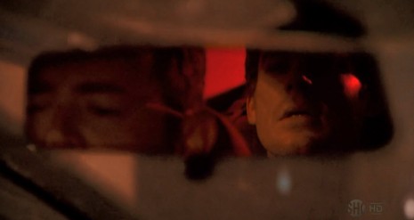 Hiding in Taylor’s back seat, Dexter throws a wire around his neck and interviews him while making him drive to his own kill site. Travis shamefully admits he wasn’t able to carry out the killings himself but that Gellar had to kill them. Discovering he’s not an actual “hands on killer,” Dexter mercifully allows Travis to live. And even returns his car for him (I wonder if he filled the tank first).