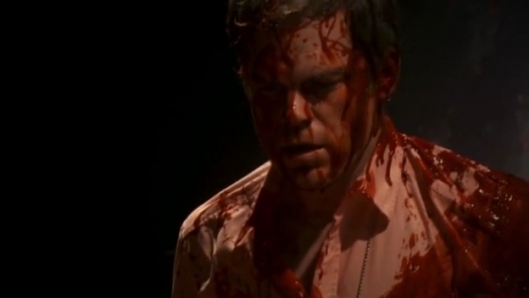 In the morning the professor’s body is discovered on his classroom stage. He’s been drained of his blood, and one of his hands has been removed. Dex and the Miami Metro gang stand around the body wondering where the bowls of blood are. Dexter, remembering this scene from Carrie, looks up and spies them in rafter but is too late to warn Masuka who shifts the body causing gallons of blood and guts to rain down on the team.