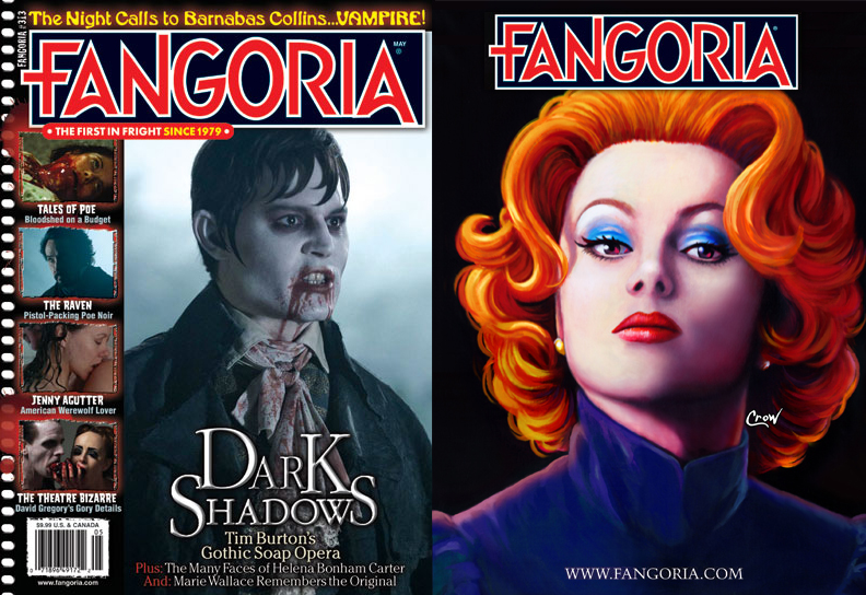 FANGORIA #313 doesn’t hit the shelves or arrive in your mailbox until next month, but here’s a peek at the covers! Both spotlighting Tim Burton’s eagerly awaited interpretation of the classic Gothic soap DARK SHADOWS, with Johnny Depp as Barnabas Collins on the front. Plus our very own artist Mark Crow’s interpretation of Helena Bonham Carter’s Dr. Julia Hoffman on the back!