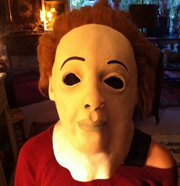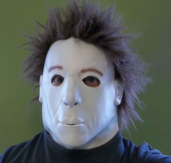 Michael Myers Mask “worn only a few times.” Nice turtleneck, chaotic hairdo, psychopathic stare and pea soup-colored background wall.