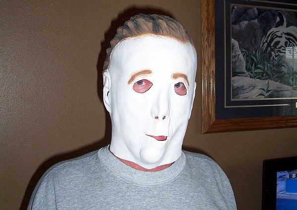 Michael Myers Mask “The mouth looks like it may have been enlarged past it’s original opening, see picture.” Just tweak the eye cuts for a Gary Busey mask.
