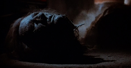 Upon seeing the severed head, I immediately thought of Michael Myers in Halloween 5. In this particular scene, Mrs. Spool’s head kind of looks like Big Neck Myers complete with nose appliance, strange hair and the rough features of the H5 mask. There is also at least one replica Myers mask that looks exactly like Mrs. Spool’s face.