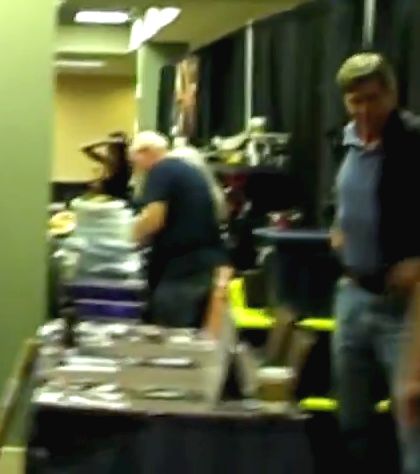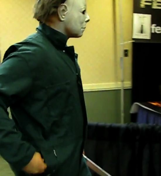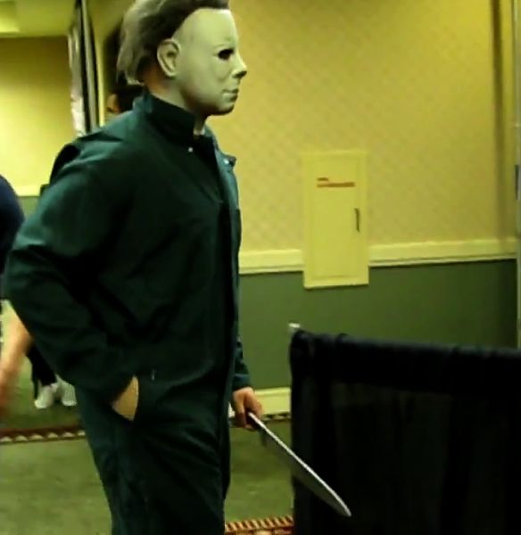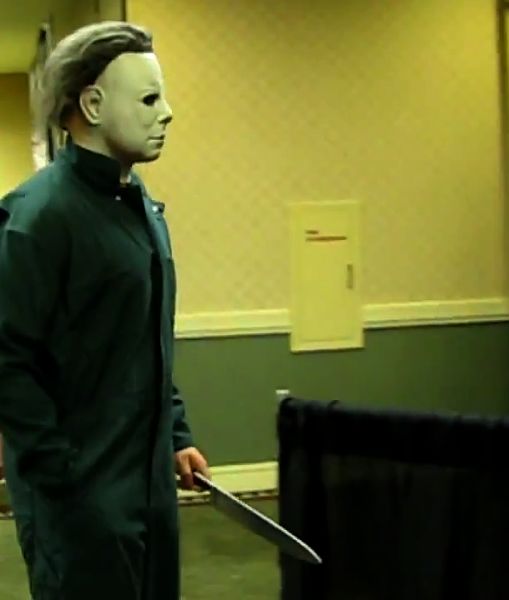 Michael Myers, with his mask, coveralls and knife, decided to show up at the recent Texas Frightmare Weekend 2014 horror convention – in addition to other celebrities like Bill Moseley (who played Z-Man in Rob Zombie’s Halloween and also had a role in Texas Chainsaw 3D), Tom Morga (who played Michael Myers for a little bit in Halloween 4 The Return of Michael Myers), George Romero and Tom Savini. The pics show something you don’t see too often which is Michael Myers with his hand in his pocket.