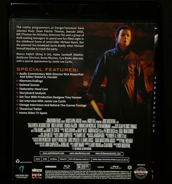 Here’s a look at the packaging for Halloween Resurrection from within the Halloween The Complete Collection Blu-ray set that is coming out next week. The cover is obviously the same as the previous DVDs and Blu-rays, but the back cover is different. They’ve re-written the synopsis of the movie a bit to say that the main stars are Sean Patrick Thomas and Thomas Ian Nicholas. Also, as you can read from the back cover, the special features are exactly the same as with prior releases of Halloween Resurrection. I do prefer the photo of Michael Myers instead of whatever they had there before on the DVD, though.