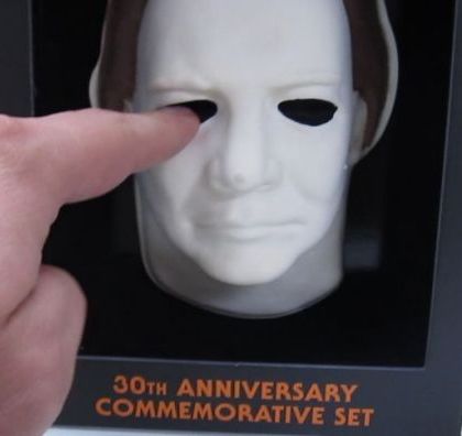 The mask looks like a cross between a squinting Robin Williams and a young Julio Iglesias. The hair resembles Easter Bunny chocolate. At least it doesn’t have eyebrows or sideburns. The mask is slightly amusing. Perhaps a new booklet with high quality behind the scenes photos could’ve been that extra something to properly commemorate the 30 years of HalloweeN.