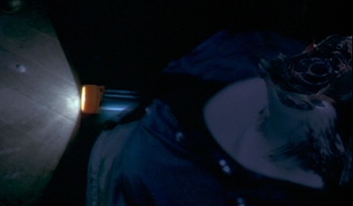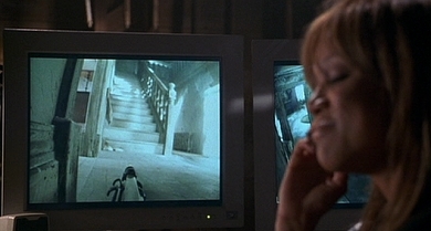 2.) In the Myers house, a video guy, Charlie, gets stabbed by Michael with a tripod. Michael then drags the body away and drops the tripod with the camera still rolling. Upon seeing the view from the dropped camera, Tyra Banks comments, “That’s a nice angle, boy!” Huh? The tripod legs are in full view of the camera. What kind of camera angle is that?