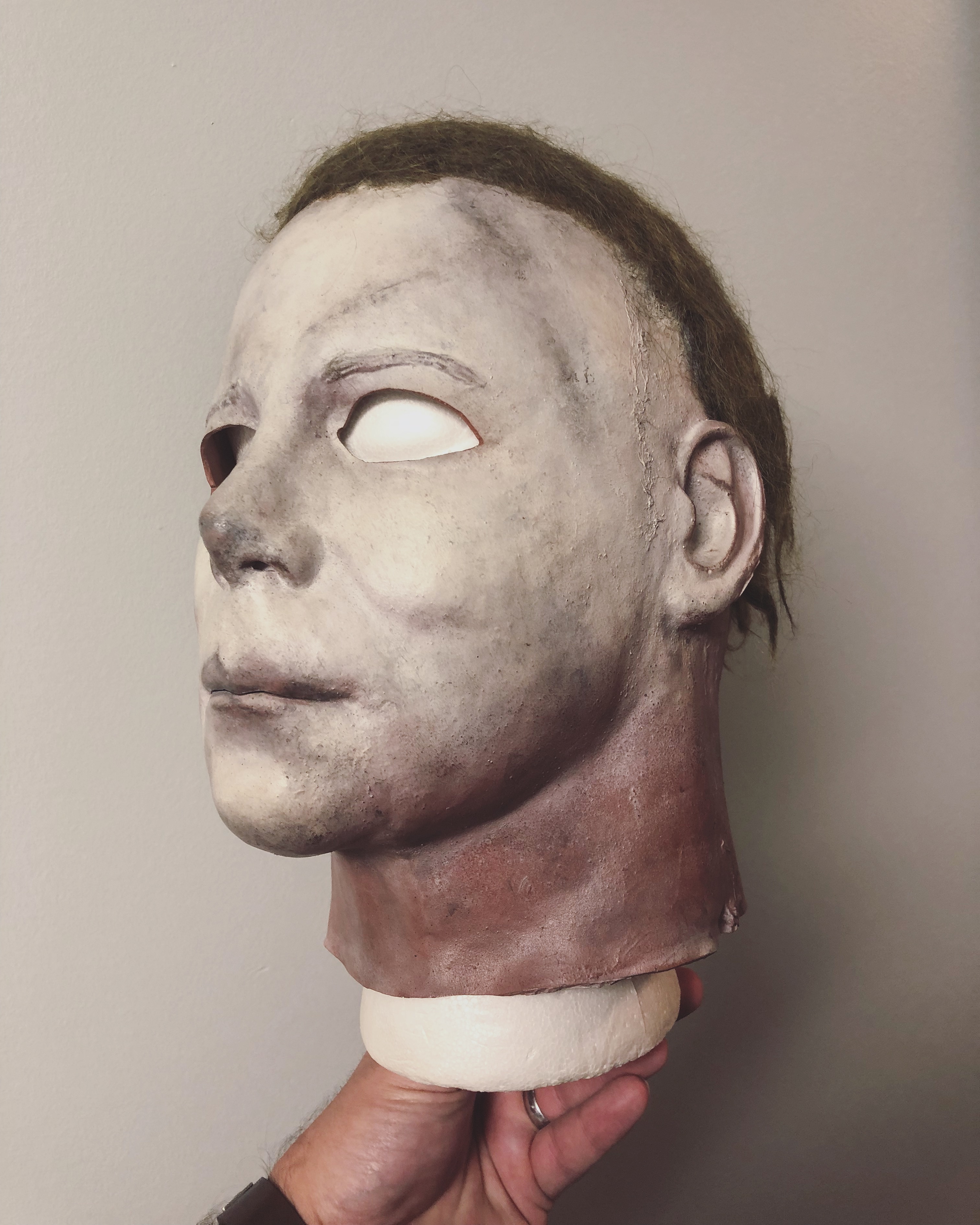 At NUMBER FIVE we have a new entry, Trick or Treat Studio’s HALLOWEEN 2018 mask. HALLOWEEN 2018 has been a huge success and we FINALLY have the franchise back on the right track. We can thank one our own in part for this accomplishment. Our old friend Justin Mabry (Trick or Treat Studios Co-founder and owner of Nightowl & Mabry’s Monsters) along with Christopher Nelson and Vince Van Dyke sculpted the mask that we see on screen! I REALLY like the look of the new mask as it keeps the characteristics of the original mask and adds on its own creepiness. Trick or Treat studios really gave the fans a gift with this one allowing all of us to own a mask true to the hero mask used in the movie. The TOTS (Trick or Treat Studios) Halloween 2018 mask is from the screen used silicon master itself! My roots are in “Indie” mask collecting but this is one time the mass produced mask wins. If you want the most screen accurate Halloween 2018 Myers you can get, this one is it and you can now get it at our store! Below is a TOTS HALLOWEEN 2018 mask given “the treatment” for one of his customers by our own JC_70 (James Carter). This looks like it could be a behind the scenes photo!: