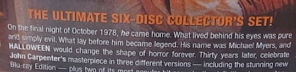 Anchor Bay has (or had) the home video rights to HalloweeN (1978), Halloween 4 and Halloween 5. Over many years, the company has released various editions of each film on DVD and blu-ray. This particular box set aimed to be “the ultimate six-disc collector’s set” (it says so on the back). But this release didn’t offer anything new to collectors. It contains previously released material. So, what is “ultimate” about this set? “Ultimate” how?