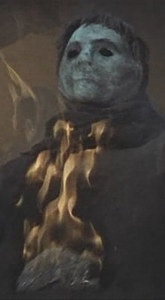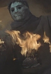 During the film’s conclusion, blazing fires occur at the mine where the zombies work. As everyone tries to get out, several zombies catch on fire. One zombie in particular caught my attention. His pale, dried up face looked like Michael Myers’ mask. His hair was also reminiscent of a Myers mask. What’s more, the zombie had empty eyes and he was wearing dark clothing.